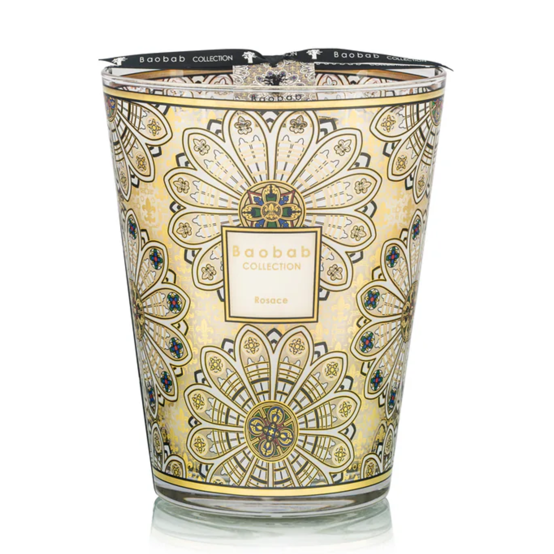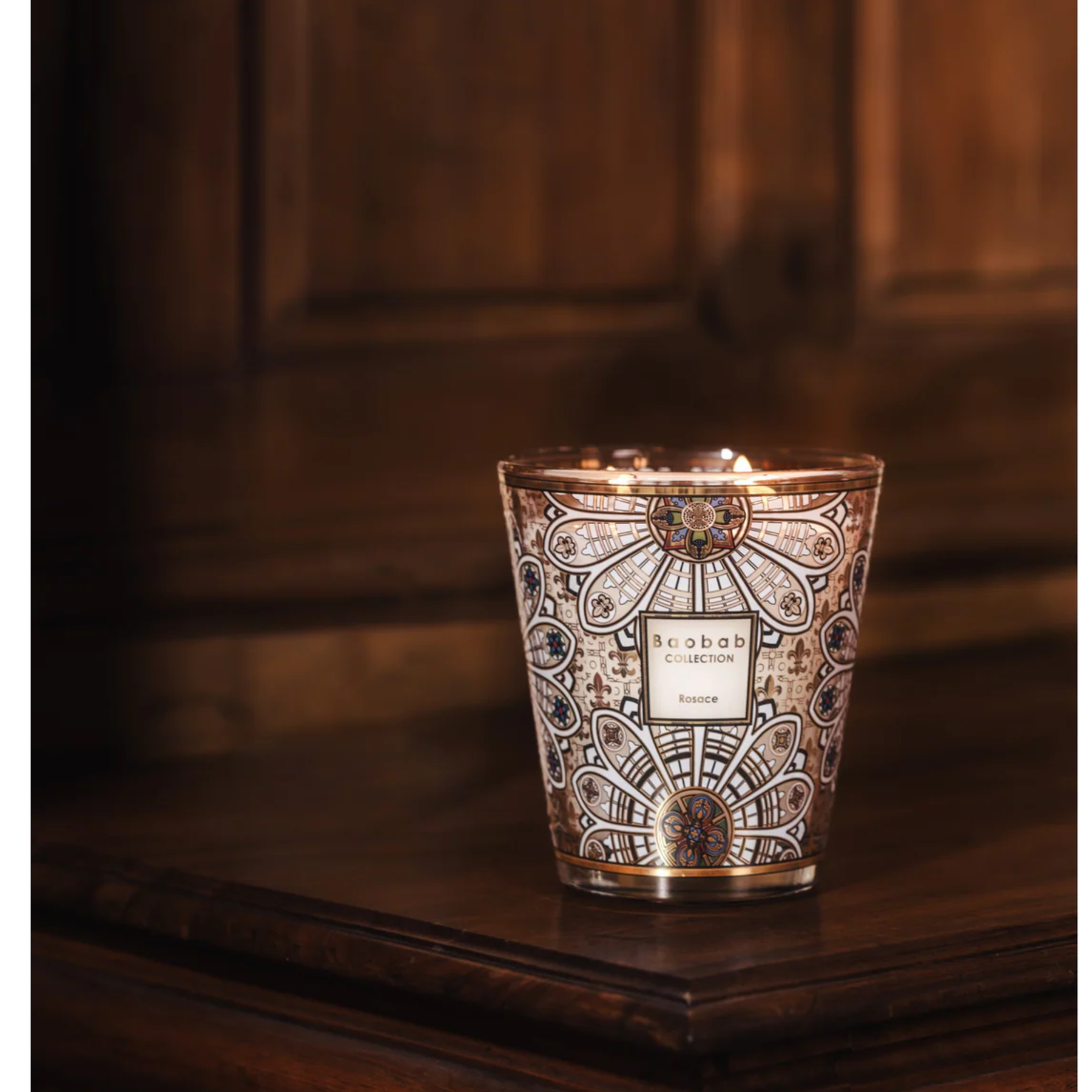 The Rosace candle pays tribute to Gothic architecture and the spiritual light of cathedrals. Its glass is covered with a precious silk-screen print, where gold and subtle colors draw motifs inspired by medieval rose windows. Like luminous lace, this refined décor is set against a background of fleur-de-lis, an emblem of nobility and purity.