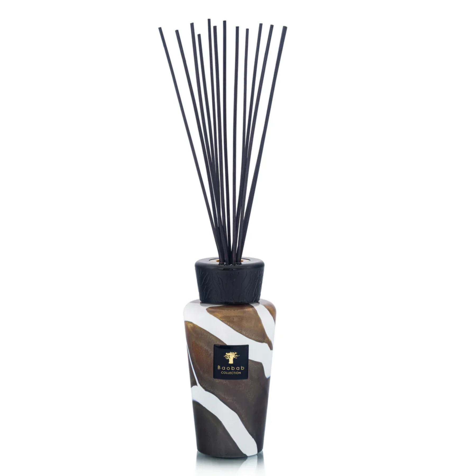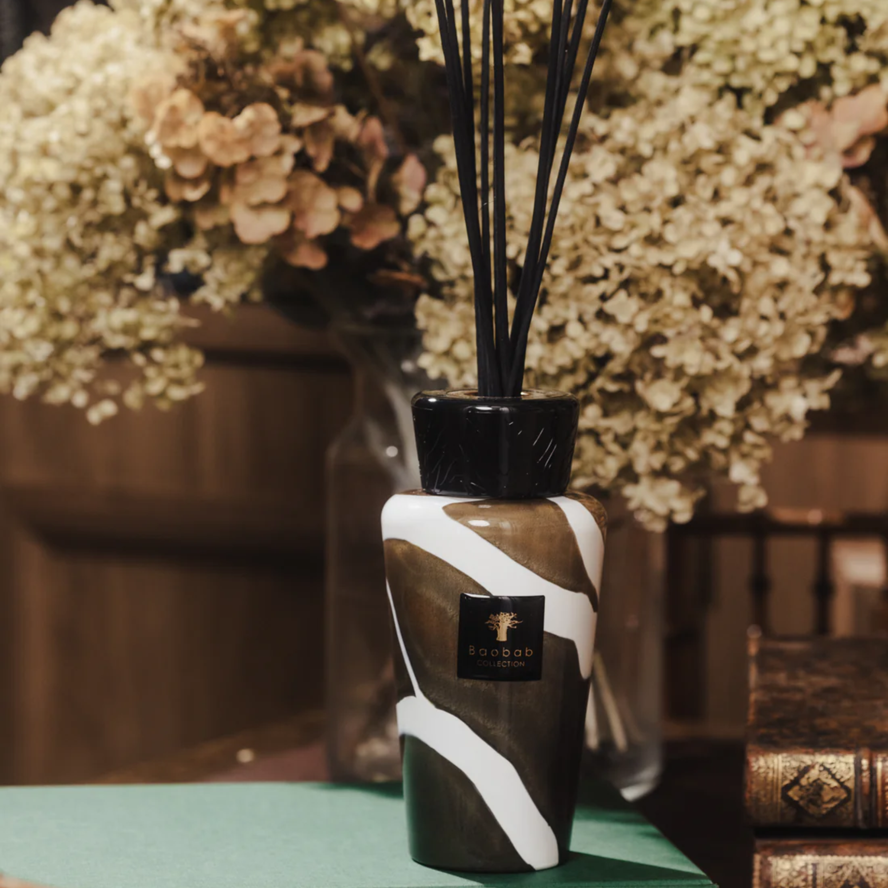 Agate perfume diffuser features the same sophisticated design as our larger editions, with a refined blend of grey-blue and khaki green. Inspired by the magic of Brazilian agate stones, its unique patterns give each piece a distinctive character. The glossy black cap completes the elegant look, while its delicate fragrance makes it both a stylish decorative object and a source of refinement for any interior.
