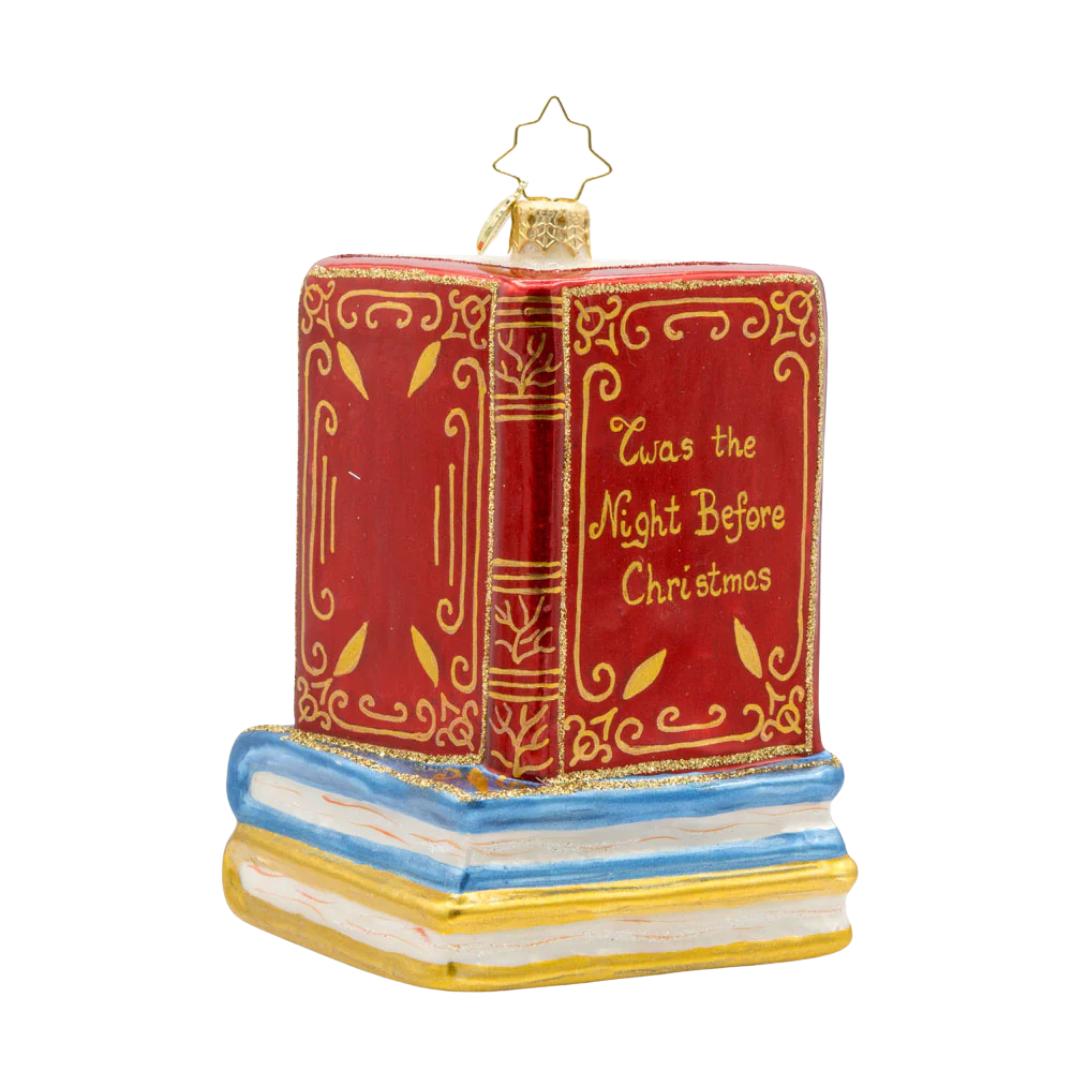 Step into a winter wonderland with this enchanting ornament featuring Santa Claus, the jolly old elf, engrossed in a classic holiday tale. Dressed in his traditional red suit and hat, Santa sits comfortably in a plush armchair, surrounded by stacks of books, including the beloved "Twas the Night Before Christmas."