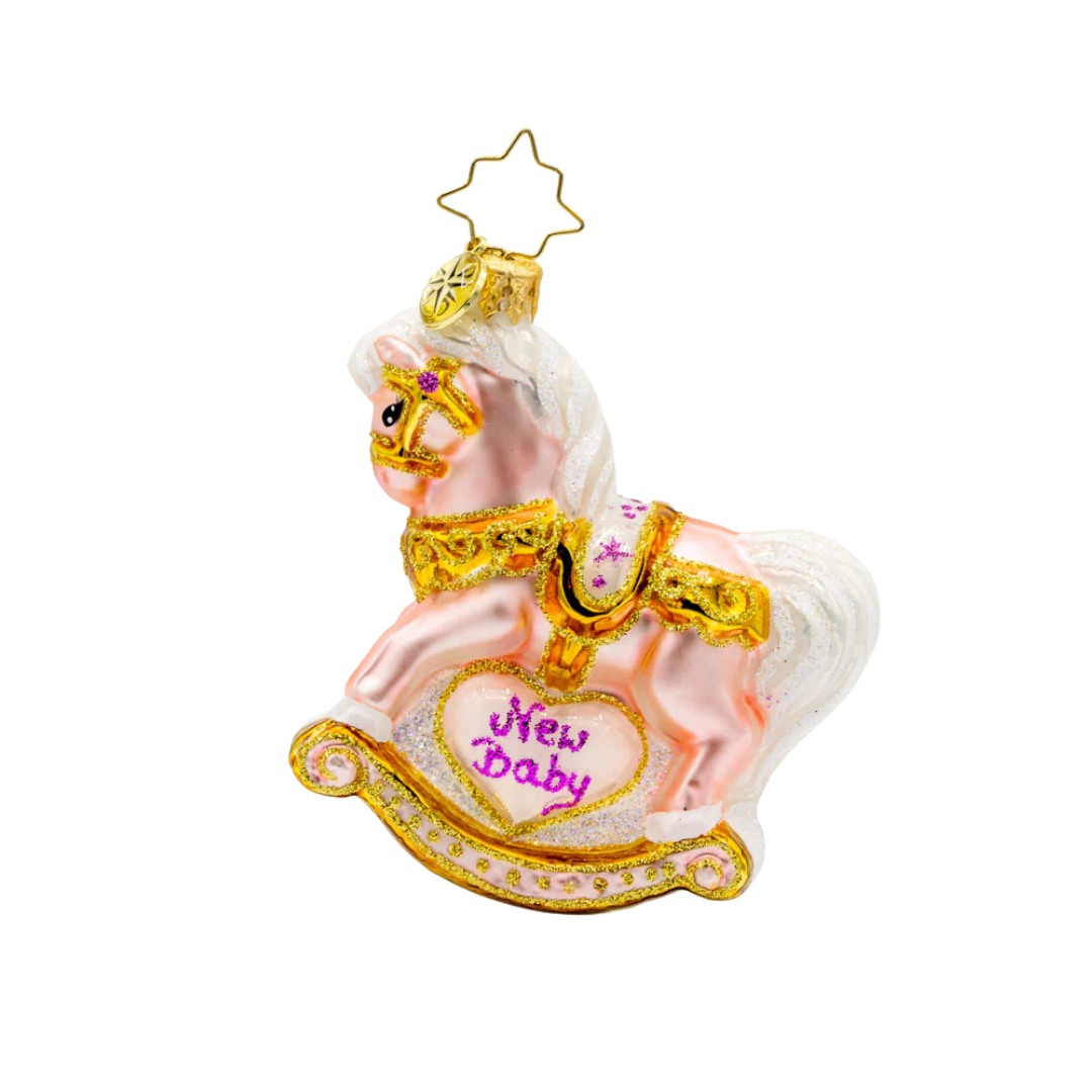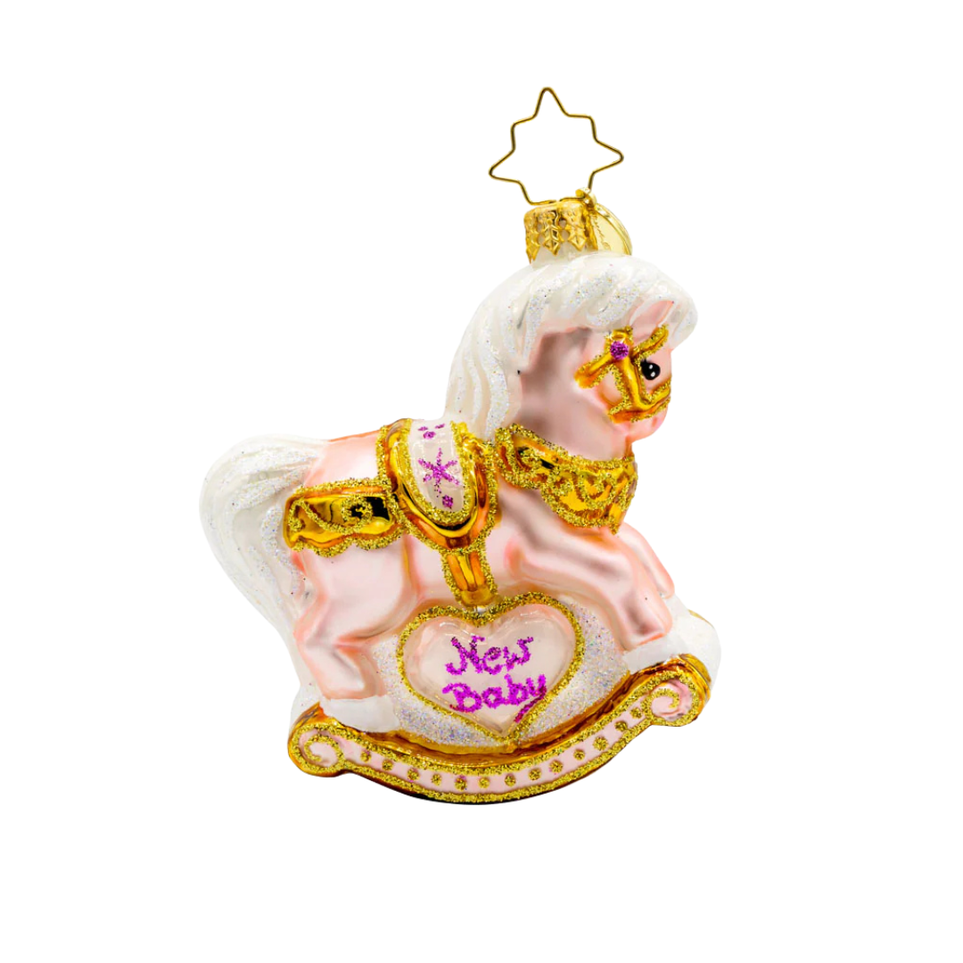 Celebrate the arrival of your precious little girl with our enchanting powder pink rocking horse ornament. A symbol of love and joy, this keepsake is more precious than words.