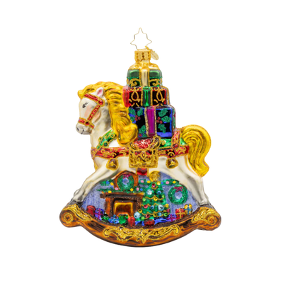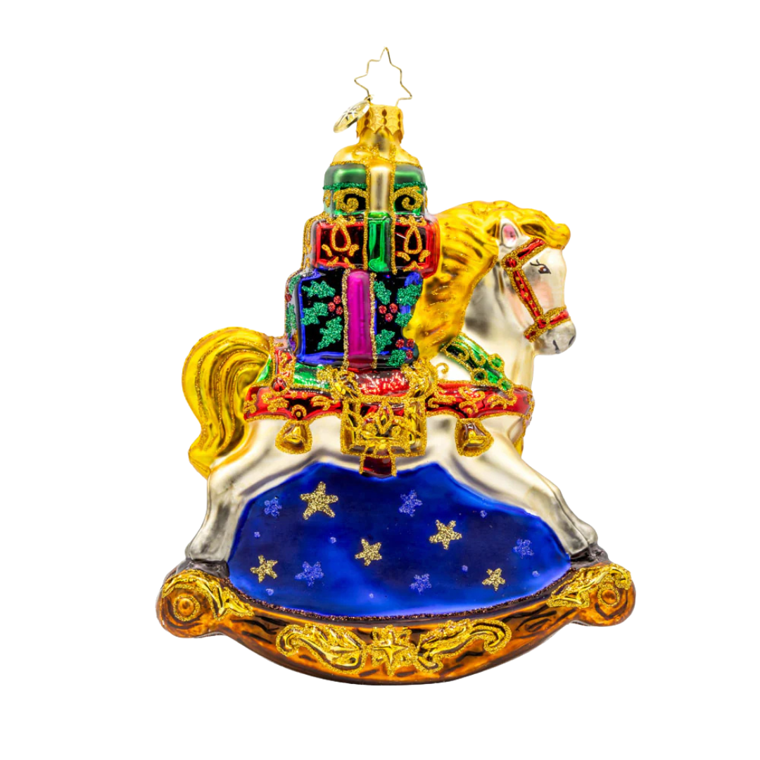 Saddle up for a holiday adventure with this charming rocking horse! Hand-painted with a festive Christmas scene, this ornament brings old-world charm and holiday cheer to your tree. It’s a timeless treasure that will make your season rock!