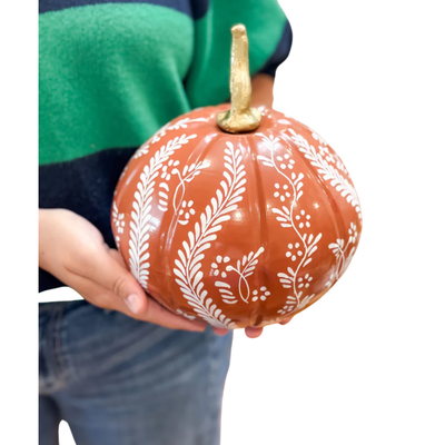 Rusty Red Pumpkin with White Floral and Vine Medium