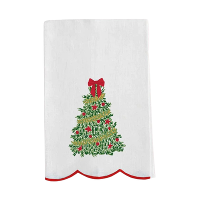 Bring timeless holiday charm to your kitchen with this beautifully embroidered tea towel from Mary Square. Featuring a classic Christmas tree adorned with red ornaments, golden garland, and topped with a festive red bow, this towel captures the spirit of traditional holiday décor. The scalloped hem edged in red adds the perfect finishing touch, making it both elegant and festive.