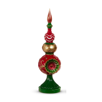 Each finial is richly detailed with gold swoops and swirls, holly leaf accents, and colorful reflectors that sparkle in the light. Their tall, pointed tops make them striking statement pieces, full of nostalgic charm. Perfect for displaying on a mantle, flanking a fireplace, or adding a traditional touch to your Christmas entryway.