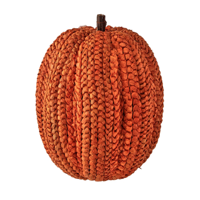 Add a charming Display Basket Weave Pumpkin to your home this fall. Crafted of natural corn husk boasting a unique basket weave design in two-toned hues. With a stem made from twigs and rib detailing this pumpkin looks like it was freshly picked from the patch. Command attention in your seasonal display, place in entryways, living rooms, or large kitchen island. A flat base makes this item easy to display. Intended for decorative use. Step into the cozy warmth of our Fall Chalet!